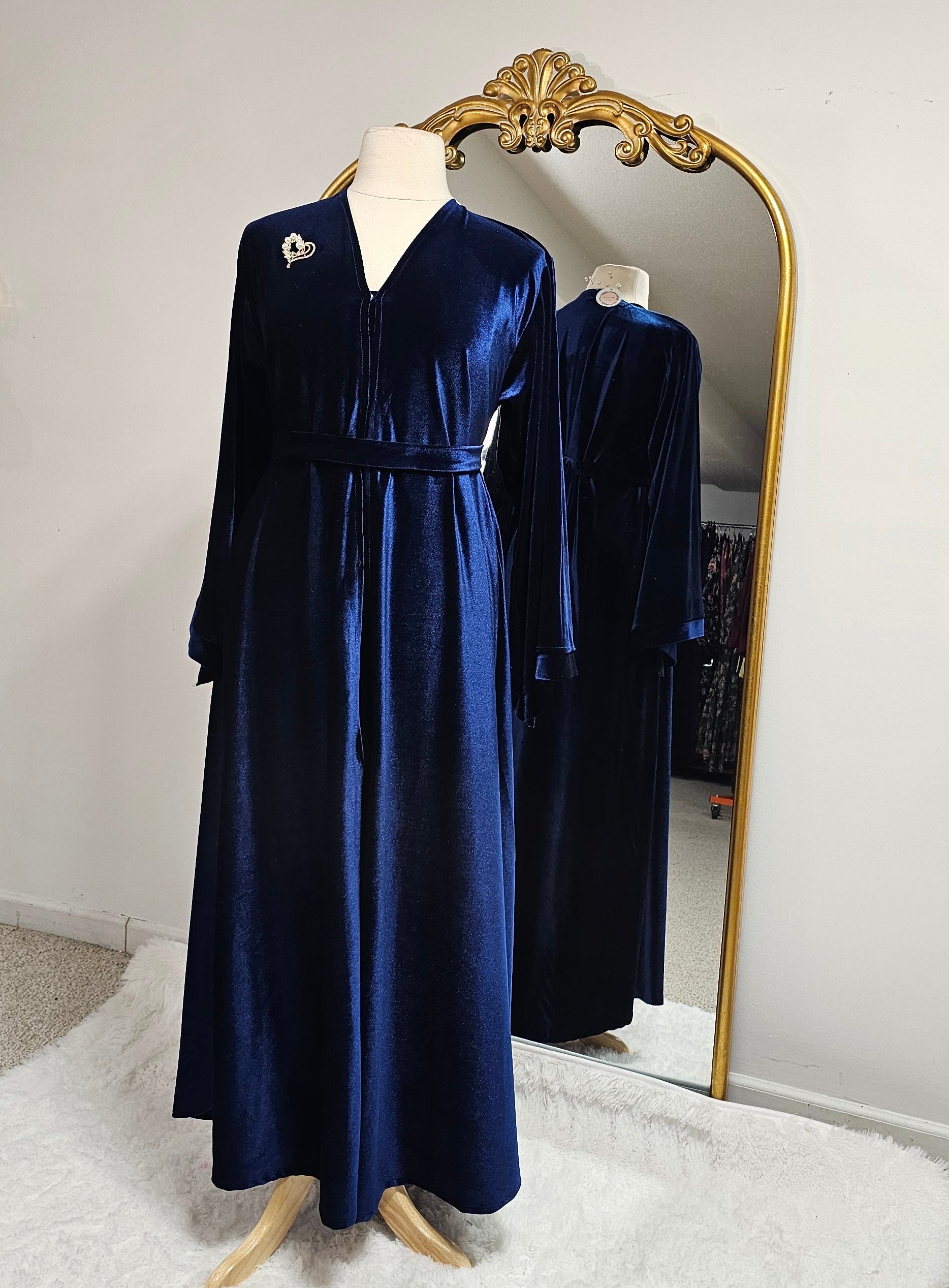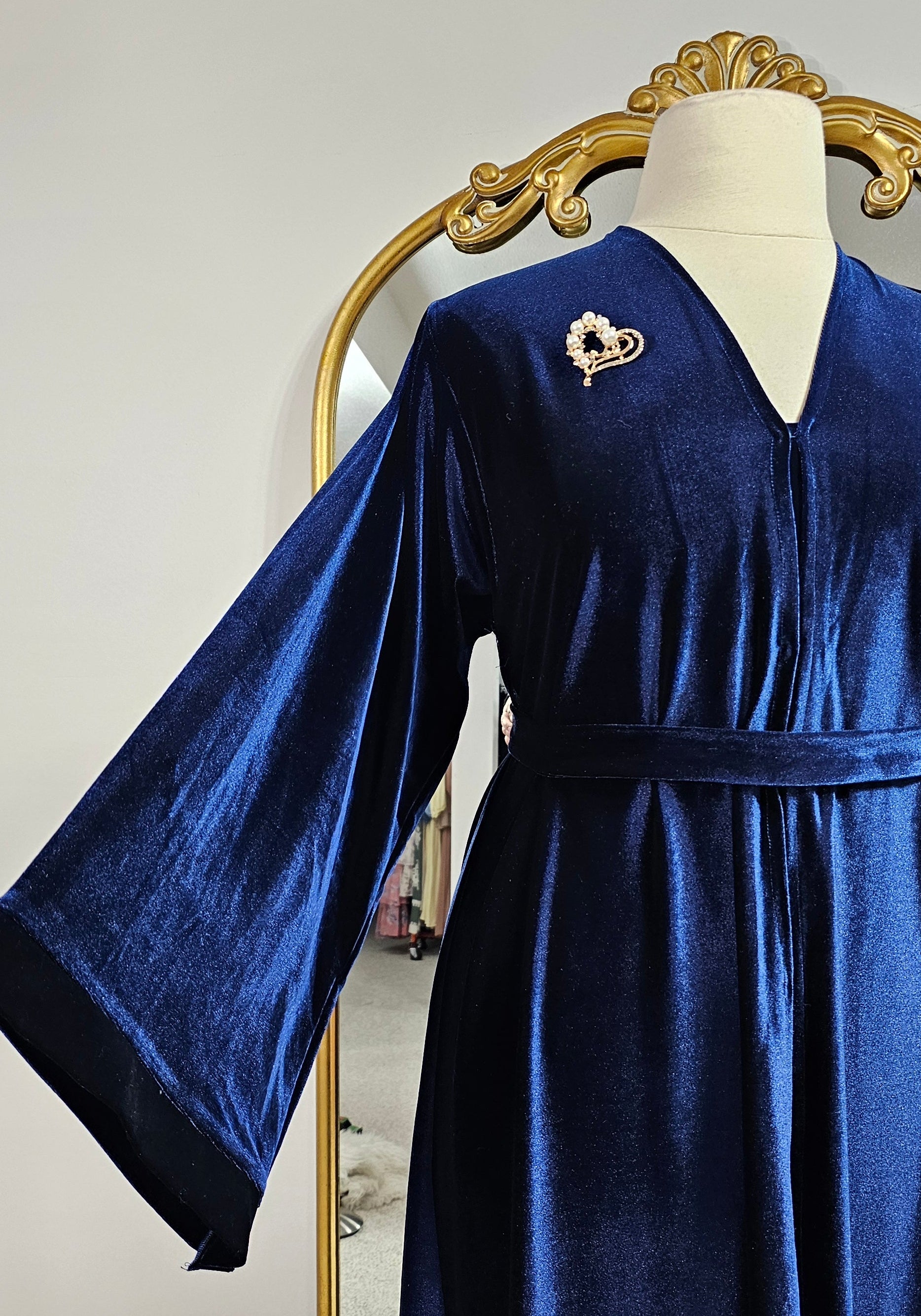 A royal velvet abaya that speaks for itself. Front snap button closure. A beautiful brooch and a matching chiffon hijab are included