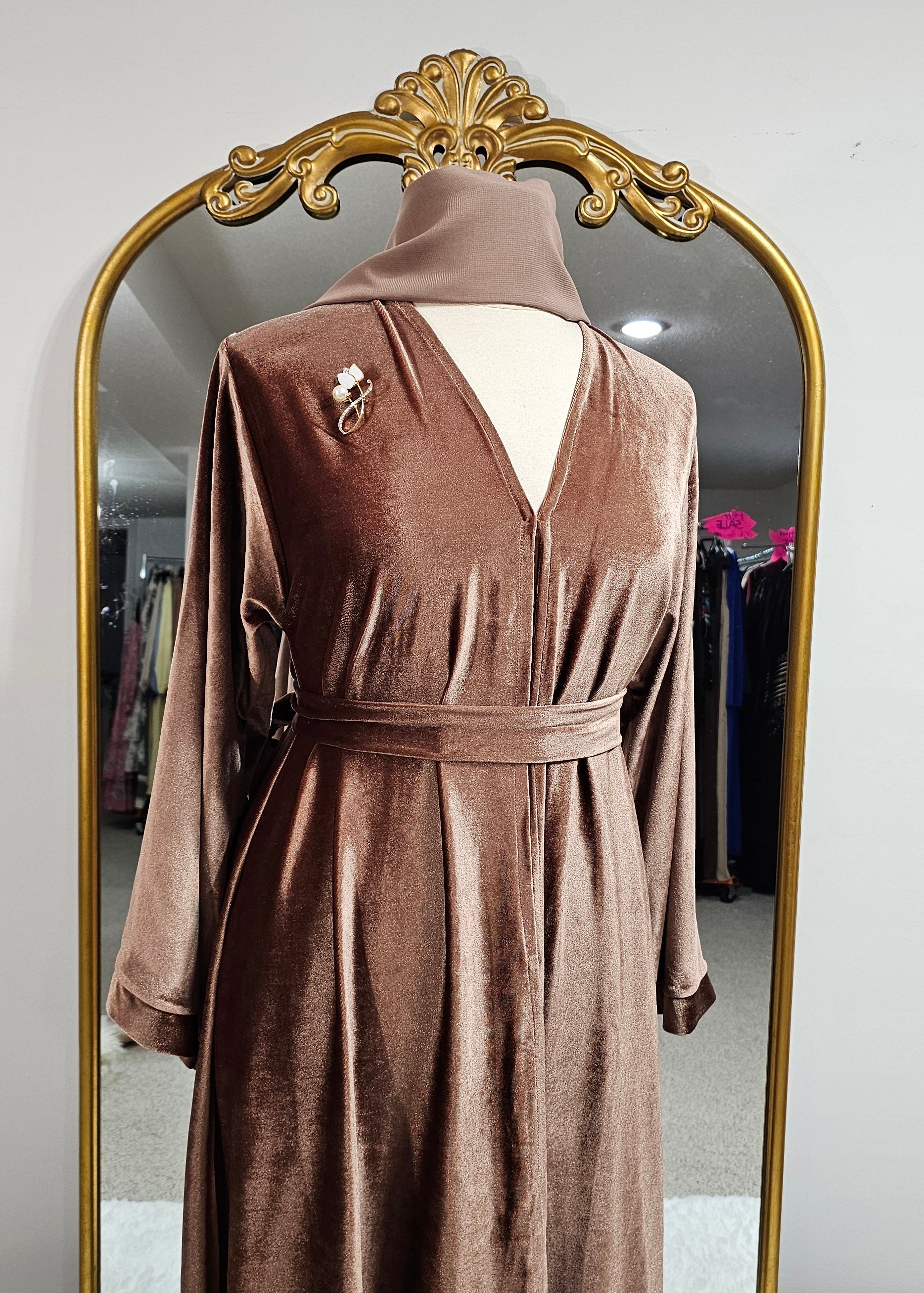 A royal velvet abaya that speaks for itself. Front snap button closure. A beautiful brooch and a matching chiffon hijab are included